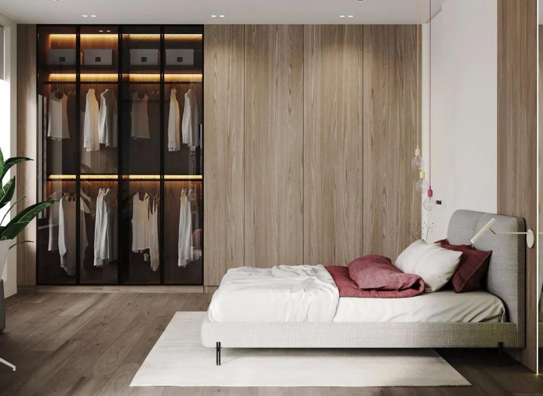卧室主要是结合现代人的审美,搭配上极简原木的风格,给人一种比较舒适的感觉。壁纸和地板颜色简单朴素。