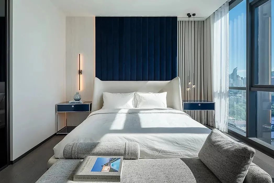 主卧采用业主最喜欢的海洋蓝为主色调,天鹅绒面料的墙面作为床头背景板,增加了空间中的华丽格调,沉稳的海洋蓝又降低了材料质感的浮夸度。