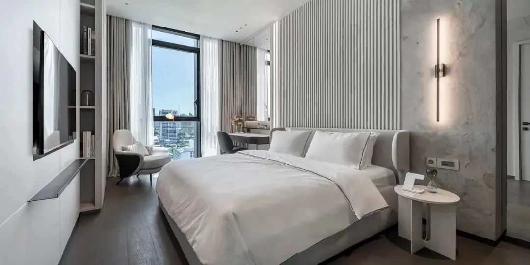 卧室选用了乳白色为基调,中性明亮的配色方案结合了室内可调节的LED光设计,更显房屋的舒适性和生活氛围。